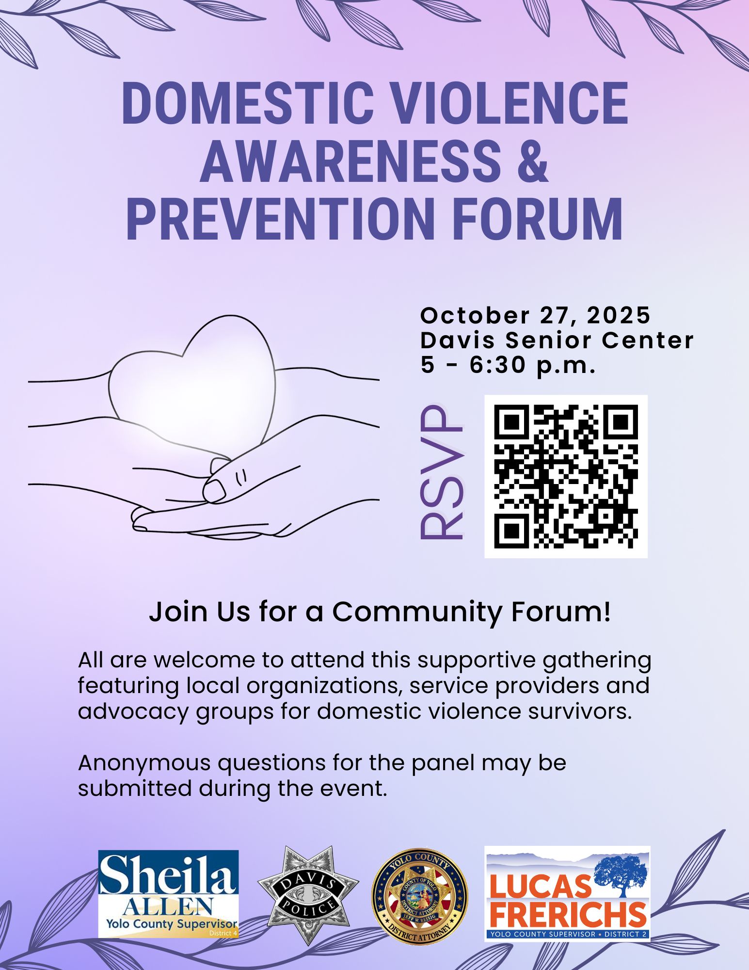 Monday, October 27, 5 – 6:30 pm, Davis Senior Center. Join us for a community forum in partnership with Supervisor Sheila Allen and Supervisor Lucas Frerichs. This supportive gathering features local organizations, service providers, and advocacy groups for domestic violence survivors.