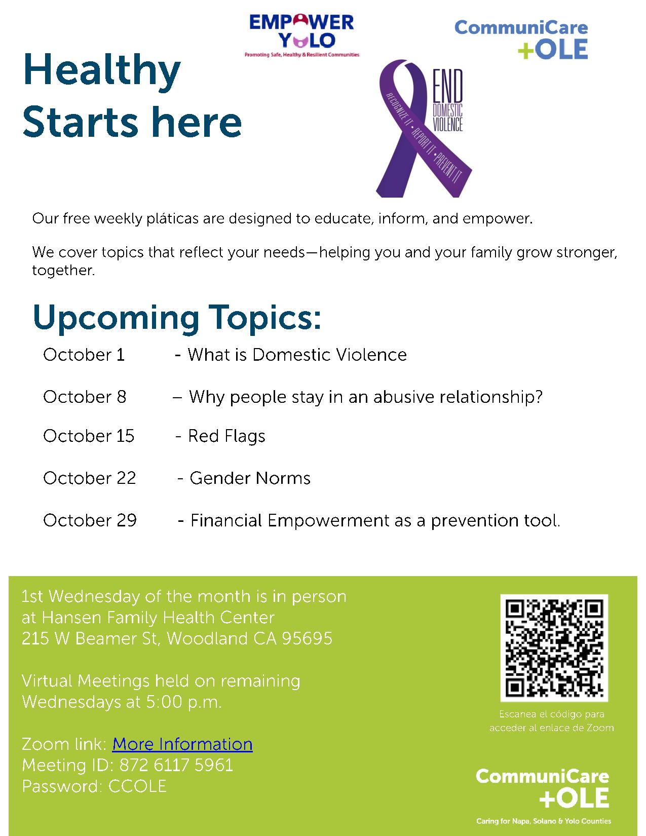 Weekly Plåticas (Conversations): In partnership with CommuniCare+Ole, the Promotores will be hosting weekly conversations in Spanish for October on Wednesdays from 5 pm – 6 pm. The October 1 meeting will be in person at the Hansen Family Health Center | CommuniCare+OLE, and the additional meetings will be on Zoom at https://us06web.zoom.us/j/87261175961?pwd=WmllU1ZOSHZMWDRpWmhBNlZYS09yZz09#success. Meeting ID: 872 6117 5961; Password: CCOLE.
