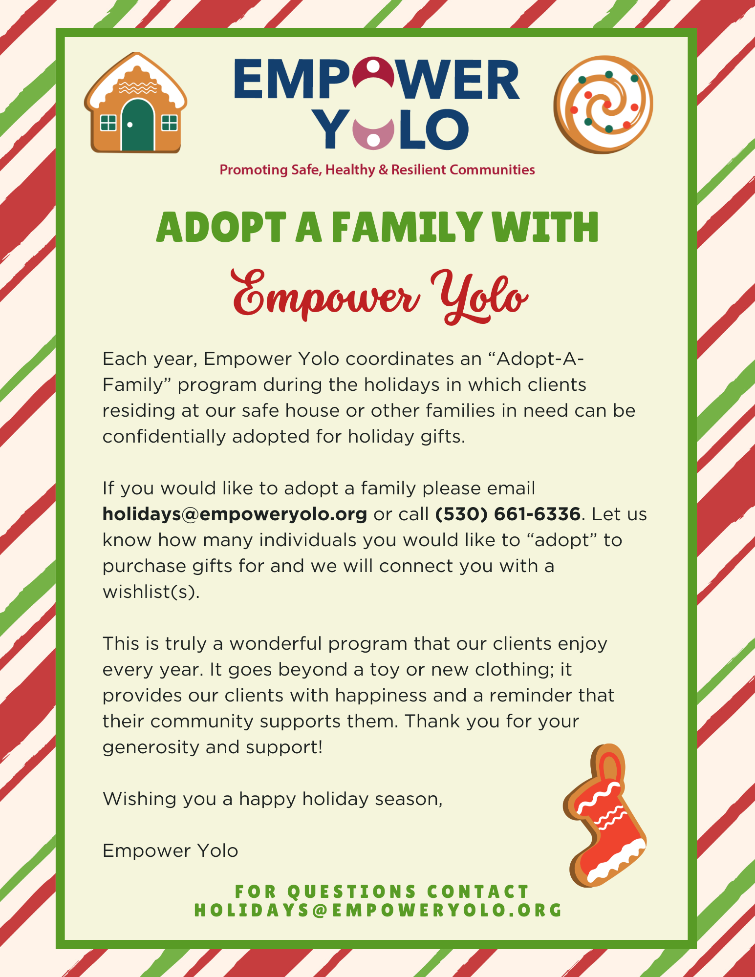 “Adopt a family” with Empower Yolo this holiday season as a meaningful way to bring joy to the families we serve. Please contact holidays@empoweryolo.org for more information, or let us know how many individuals you would like to purchase gifts for, and we will connect you with a wishlist(s). Wishlists will be available mid-November, and we ask that gifts be donated by December 12.