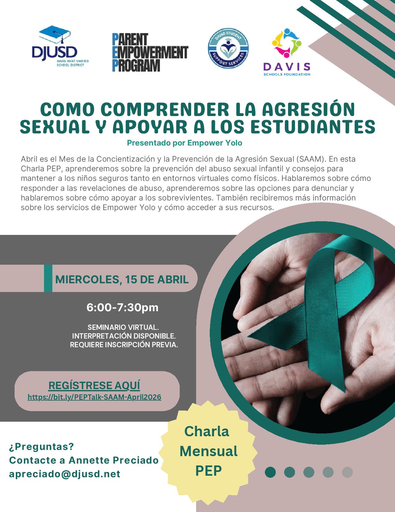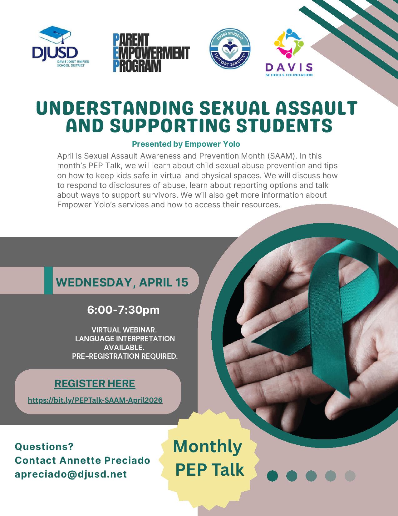 Understanding Sexual Assault & Supporting Students. Learn about child sexual abuse prevention, how to keep kids safe in virtual and physical spaces, how to respond to disclosures, reporting options, and ways to support survivors. Wednesday, April 15, 6:00–7:30 p.m. Register at https://bit.ly/PEPTalk-SAAM-April2026.