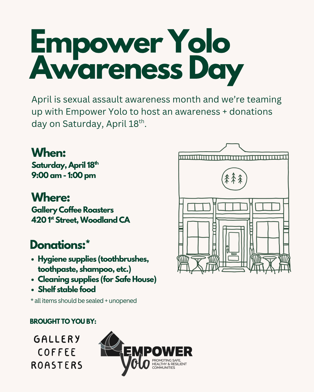 Participate in the Gallery Coffee event on Saturday, April 18, 9 a.m.–1 p.m. at Gallery Coffee Roasters in Woodland. Donate new hygiene items, cleaning products, or food. Thank you to Gallery Coffee Roasters for their partnership.
