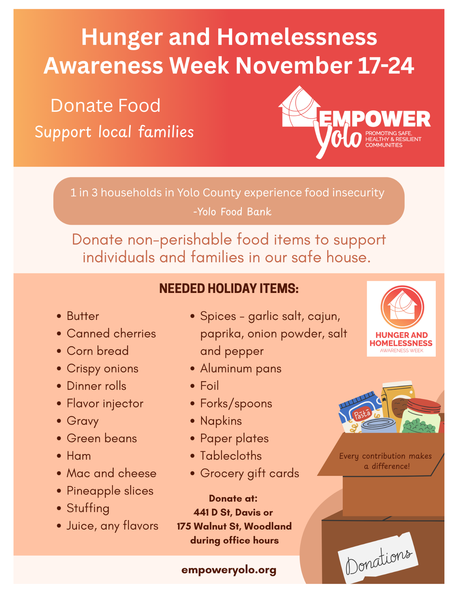 This November, during Hunger and Homelessness Awareness Week and Thanksgiving, let’s reflect on the families and neighbors in our community facing food and housing insecurity. Empower Yolo invites you to join us in supporting this national campaign through educational, service, action, and fundraising activities that raise awareness, provide support, and bring hope to those in need.