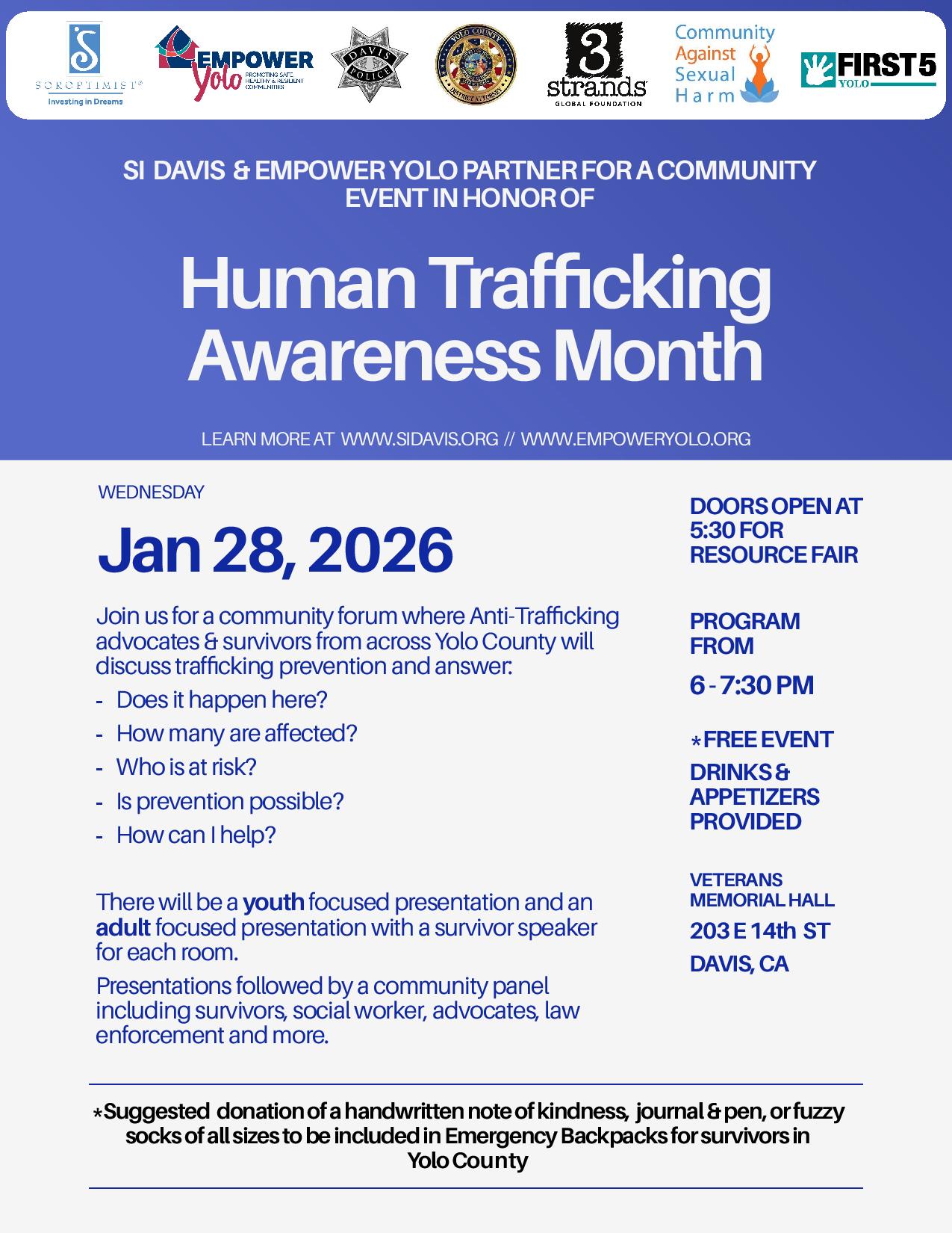 Join Empower Yolo and community partners this month to raise awareness about human trafficking and support survivors. See information on the upcoming community forum in Davis. Please attend and share information.