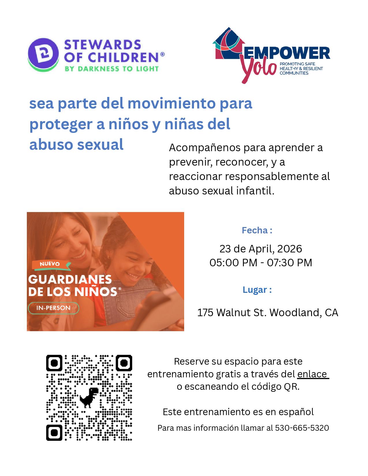 Attend a Stewards of Children Child Sexual Abuse Prevention Workshop on April 23 (English) or April 30 (Spanish), 5–8 p.m. at Empower Yolo, 175 Walnut Street, Woodland.