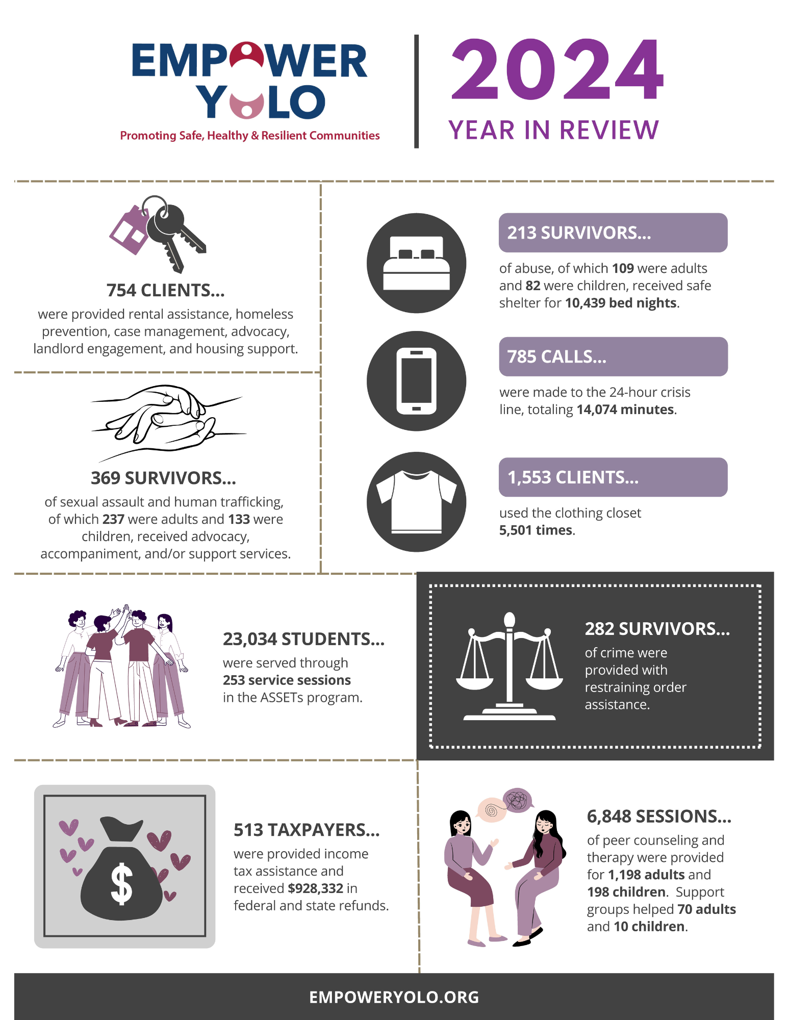 Please see all the great work Empower Yolo was able to accomplish in 2024, supporting survivors of domestic violence, sexual assault, and human trafficking, and families in need.  Thanks to our donors, sponsors, and community support, we were able to expand services again this year to meet the needs of the community.